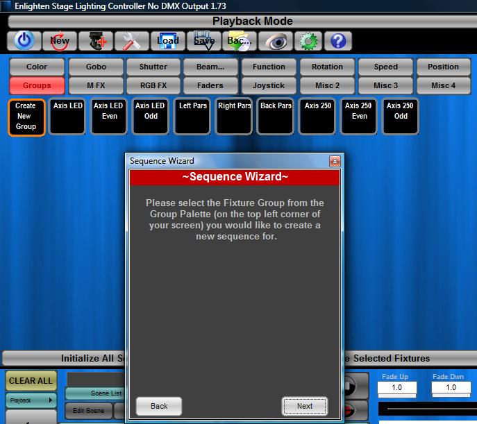 The basic component of a light show in Enlighten is the Sequence Button. It allows you to create a button that calls a look you programmed and then play multiple buttons at the same time. So this technique allows the user to build the looks for each of the fixture group one at a time and then play them back at the same time to create the final look of all lights in the show together. Here are the steps we take to create our first button using the sequence wizard. 1. Switch to 'Playback Mode' using the button on the top right hand corner of the Enlighten window. 2. Right click in the button field and select Create New Button 3. The Start Wizard screen will appear. Select the Sequence Button Option and press the Start Button.