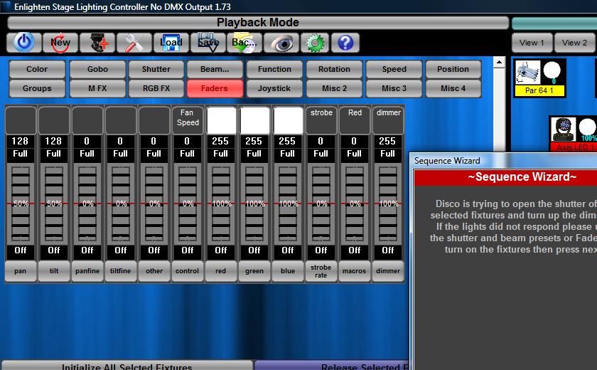 5. Next the wizard will ask you to make sure the shutter has opened and the selected lights are pointing down. If not, use the faders to alter the values that make the light turn on. In most cases LEDs will show no response. Just continue to the next step.