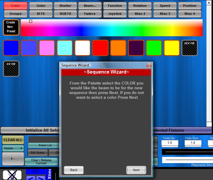 6.Once the light is on press the next button. The Wizard will now ask you to select the color you would like for the fixtures selected. Select the color you would like for this Sequence Button and press the Next Button. DO Not Select A Color for RGB FX.