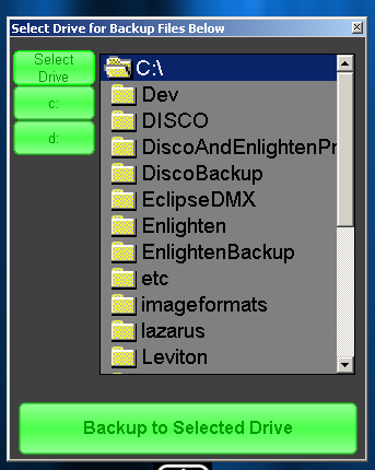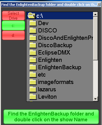 The dialog below will display in the center of the screen. To Backup press the Backup Current Show Button The next dialog below will appear in the center of the screen. This dialog allows us to choose which Drive to back up our files to. We can choose to backup to a local hard drive on the computer or back up to some external media like USB drives etc, by selecting the corresponding driver letter and pressing the 'Backup to Selected Folder/Drive button. The backup process will create a EnlightenBackup Folder on the selected drive and create a sub directory using the current show name. In that show name file all the files needed will be stored and copied. Depending on the drive type, some drives are slower than others, the dialog will state the backup was successful. To Restore a show from a drive Follow the steps below To Restore a show click on the backup icon on the toolbar.